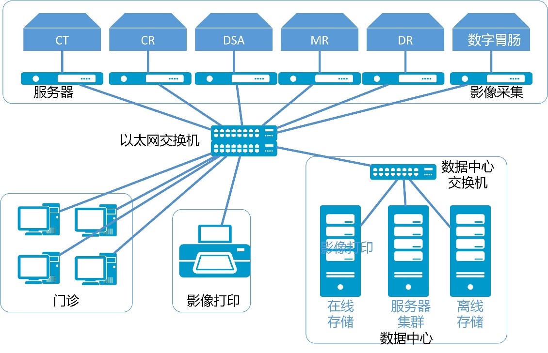 該方案是針對三甲級以上或大醫院的全院級PACS解決方案,將放射科、超聲科、內窺鏡、病理等影像科室接入PACS系統,并通過PACS與HIS融合,實現全院影像采集、存儲、傳輸、診斷數字化。